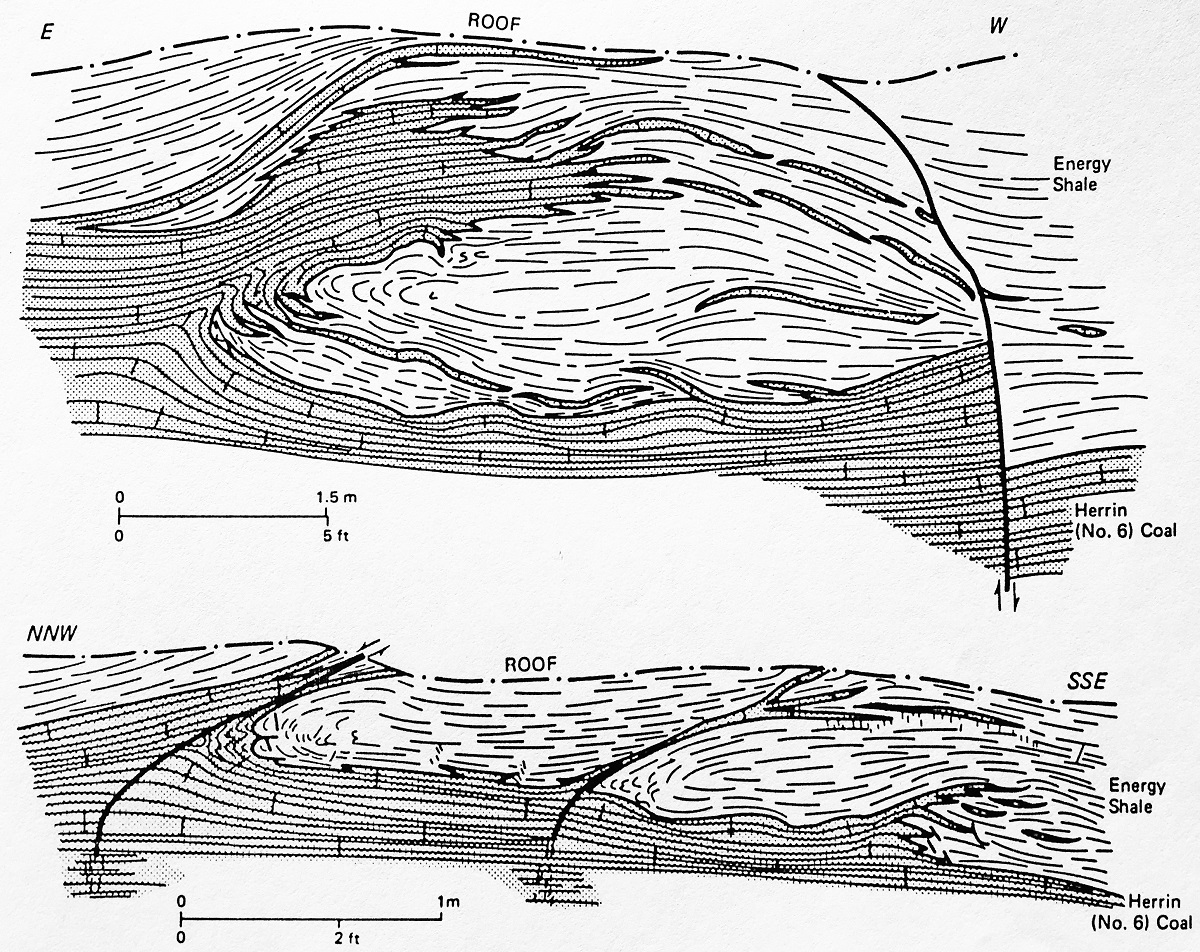 These types of rolls have been encountered in several western Kentucky coal seams, including the W. Ky. No. 4 (Greb and others, 2001). In the No. 4 coal, the rolls occurred in a parallel set with relatively straight orientations. Similar straight-oriented swarms of shale rolls have been encountered above the Herrin (Illinois No. 6, W. Ky. No. 11) coal seam in Illinois, where they may trend parallel to the local trend of the contact between the gray Energy Shale Member (Illinois term), and the harder black Anna Shale Member (Illinois term) Shelburn Formation, in the mine roof (Nelson, 1983; Krausse and others, 1979). In at least one mine in southern Illinois, gray shale rolls follow a narrow sinuous trend of dark Anna Shale in the immediate roof (Bauer and DeMaris, 1982; Nelson, 1983). Straight-oriented rolls (especially those occurring in parallel sets) may have formed from tectonic stresses and tensional cracks, while sinuous rolls more likely formed from channel processes during deposition of the roof strata.