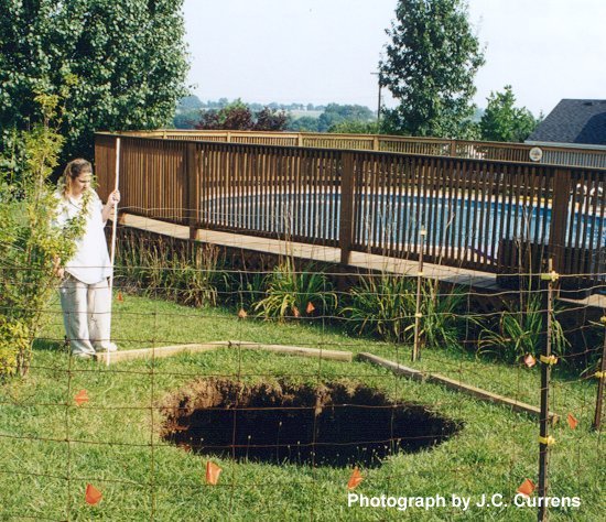 Serious property damage was narrowly avoided when this cover-collapse sinkhole developed near an above-ground swimming pool in a residential backyard in Boyle County. Photograph by James C. Currens.This sinkhole in Warren County collapsed on February 25, 2002. It is primarily the results of cover collapse, but also partially involved the collapse of a section of cave roof. Sinkhole development involving the collapse of bedrock is extremely rare, and this is one of the very few documented cases in Kentucky. Stormwater was routed underground at three of the four corners of the road junction. The location of the sections of cave passage with unstable ceiling was known prior to construction of the road and a safe route for the road was recommended by karst experts. For reasons unknown, the roadway was nevertheless built over the unstable area. The cost for repair of the road has not yet been estimated. Photograph by J. D. Kiefer.Geologists and soil scientists examine a large cover-collapse sinkhole in Hart County near Munfordville, Ky., which opened in the summer of 1998. Photograph by J. D. Kiefer.
