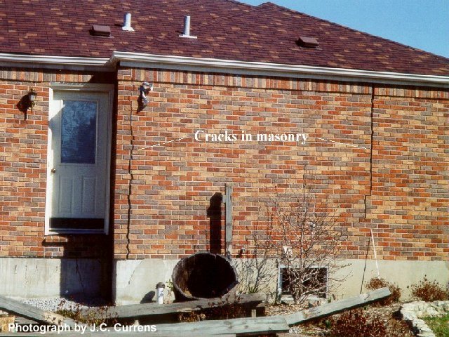 The cracks in the masonry show the damage caused by a cover-collapse sinkhole. The total damage to this home, located near Louisville, Ky., was over $40,000. Photograph by James C. Currens.